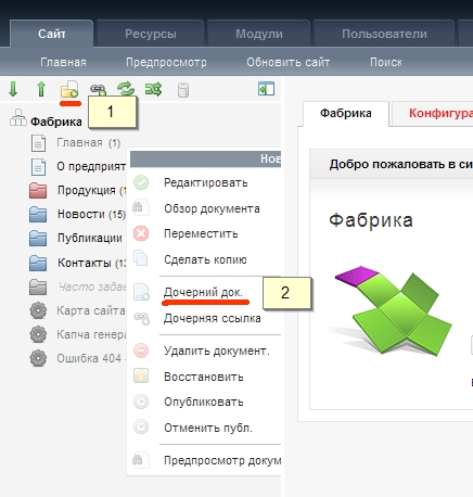 Чтобы создать документ в корне сайта, кликните на иконку-папочку [1] над девером документа. Чтобы добавить документ в уже имеющеюся папку, кликните правой кнопкой мыши на папку и в появившемся меню выберите пункт "Дочерний документ" [2].