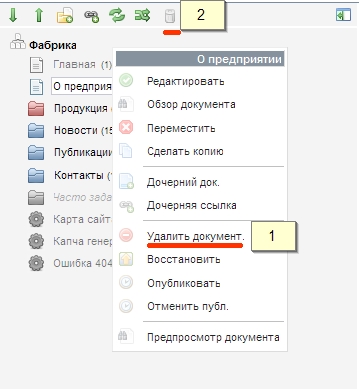 Чтобы удалить документ, кликните на его название правой кнопкой мыши и выберите пункт "Удалить документ" [1], после чего документ попадёт в корзину. Чтобы очистить корзину кликните на иконку над деревом документов [2].