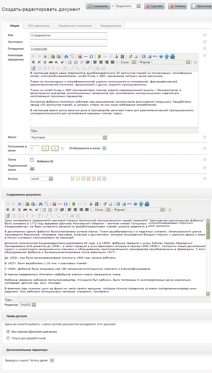 Чтобы войти в режим редактирования документа просто кликните на его название в дереве документов. В режиме редактирования Вы можете изменять основные параметры документа (например: заголовок, содержимое), задавать SEO-параметры страницы, а также управлять его потомками (см. скриншот № 2) .