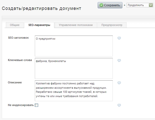 Скриншот №4. Редактирование документа: вкладка "SEO-параметры"