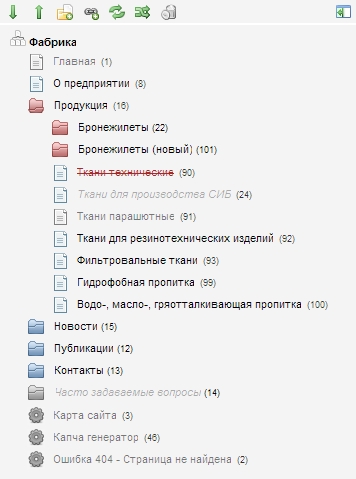 Документ "Ткани парашютные" (91) отображается светло-серым ненаклонным шрифтом – это значит, что он опубликован, но не отображается в меню.
